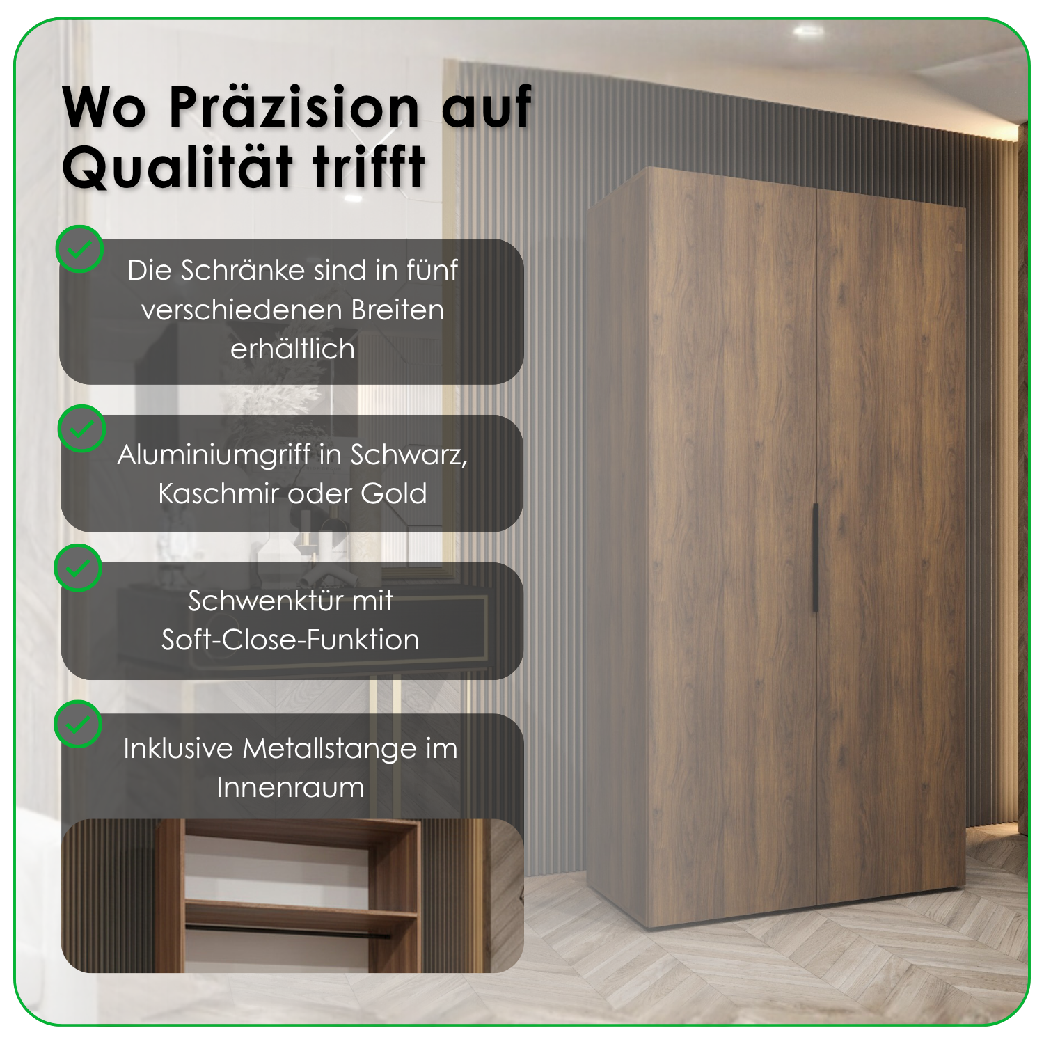 • Individuelle Akzente: Geben Sie Ihrem Schrank den letzten Schliff! Wählen Sie zwischen edlen Metallgriffen in Gold, Schwarz oder Kaschmir, um den Look perfekt an Ihr Interieur anzupassen.
