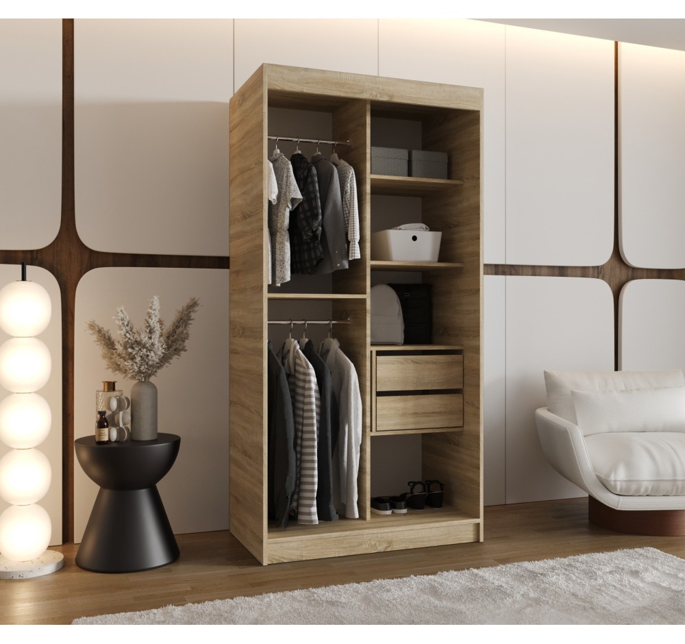 Suchen Sie ein Möbelstück, das Ihre gesamte Garderobe aufnimmt und gleichzeitig Ihr Schlafzimmer optisch vergrößert? Unser Schiebetürenschrank ist die perfekte Kombination aus modernem Design und zuverlässiger Funktionalität. Dank der breiten Farbpalette und kompakten Maße fügt er sich ideal in jedes Interieur ein!