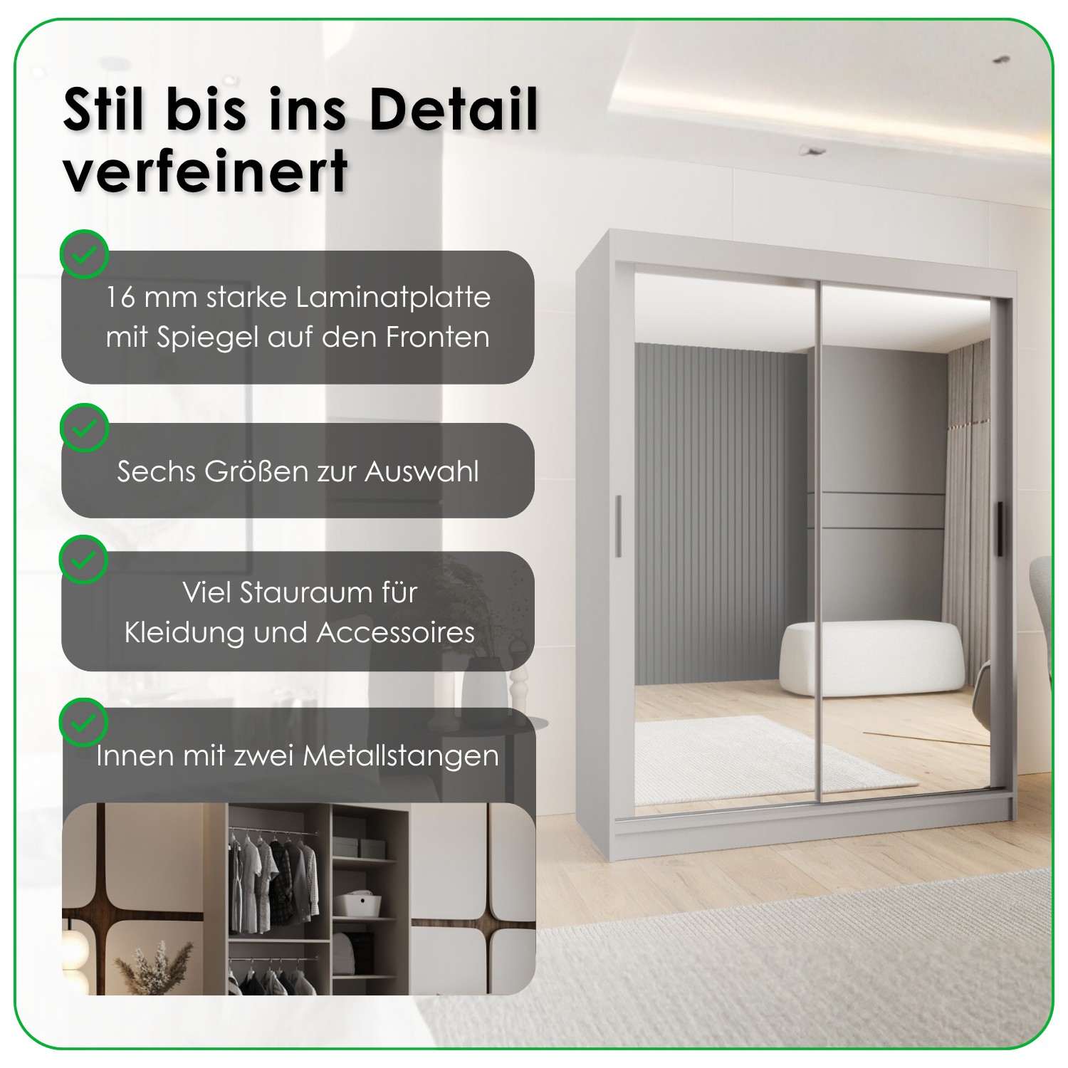 Suchen Sie ein Möbelstück, das Ihre gesamte Garderobe aufnimmt und gleichzeitig Ihr Schlafzimmer optisch vergrößert? Unser Schiebetürenschrank ist die perfekte Kombination aus modernem Design und zuverlässiger Funktionalität