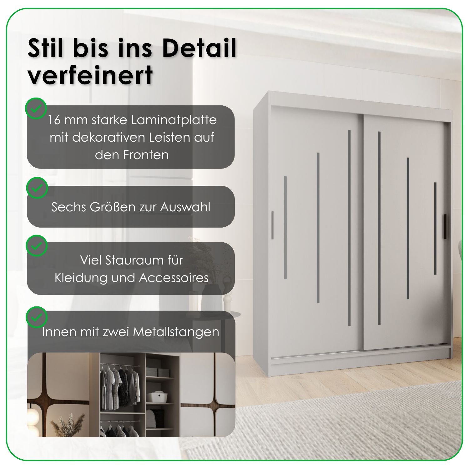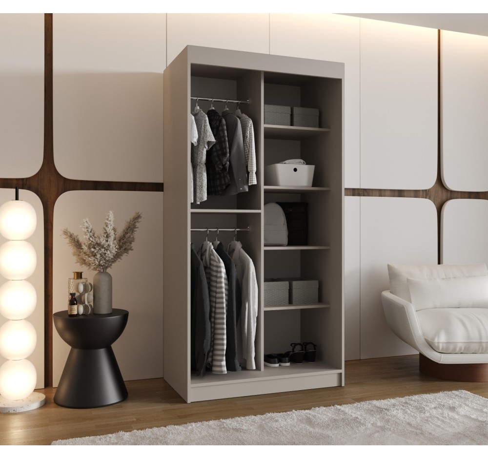 Suchen Sie ein Möbelstück, das Ihre gesamte Garderobe aufnimmt und gleichzeitig Ihr Schlafzimmer optisch vergrößert? Unser Schiebetürenschrank ist die perfekte Kombination aus modernem Design und zuverlässiger Funktionalität