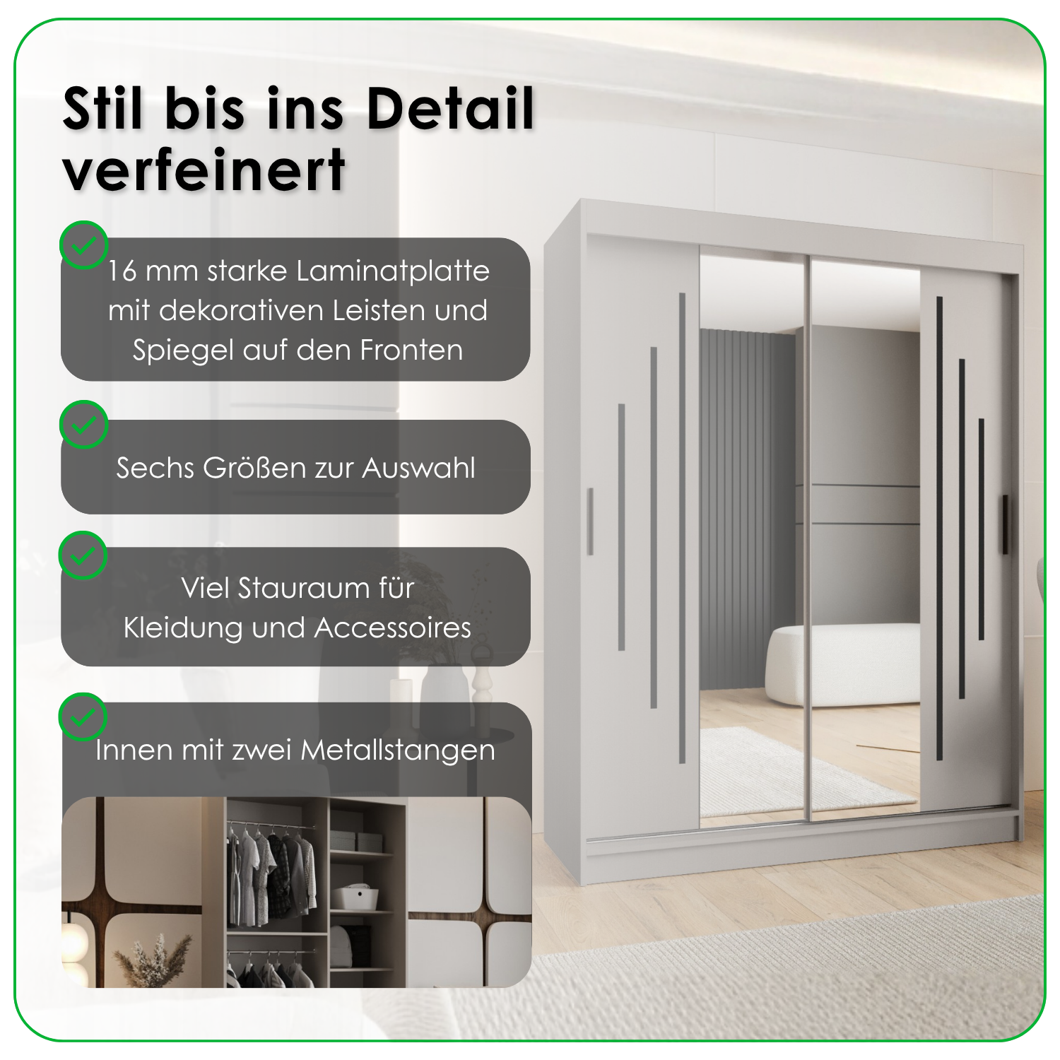 Suchen Sie ein Möbelstück, das Ihre gesamte Garderobe aufnimmt und gleichzeitig Ihr Schlafzimmer optisch vergrößert? Unser Schiebetürenschrank ist die perfekte Kombination aus modernem Design und zuverlässiger Funktionalität
