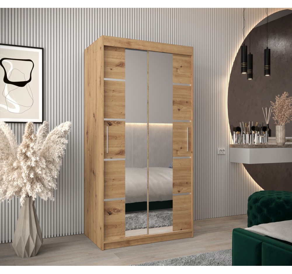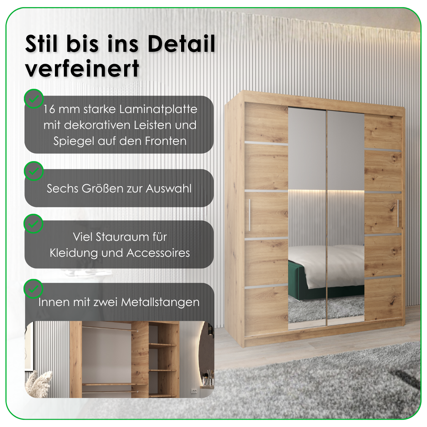 Suchen Sie ein Möbelstück, das Ihre gesamte Garderobe aufnimmt und gleichzeitig Ihr Schlafzimmer optisch vergrößert? Unser Schiebetürenschrank ist die perfekte Kombination aus modernem Design und zuverlässiger Funktionalität. Dank der breiten Farbpalette und kompakten Maße fügt er sich ideal in jedes Interieur ein!