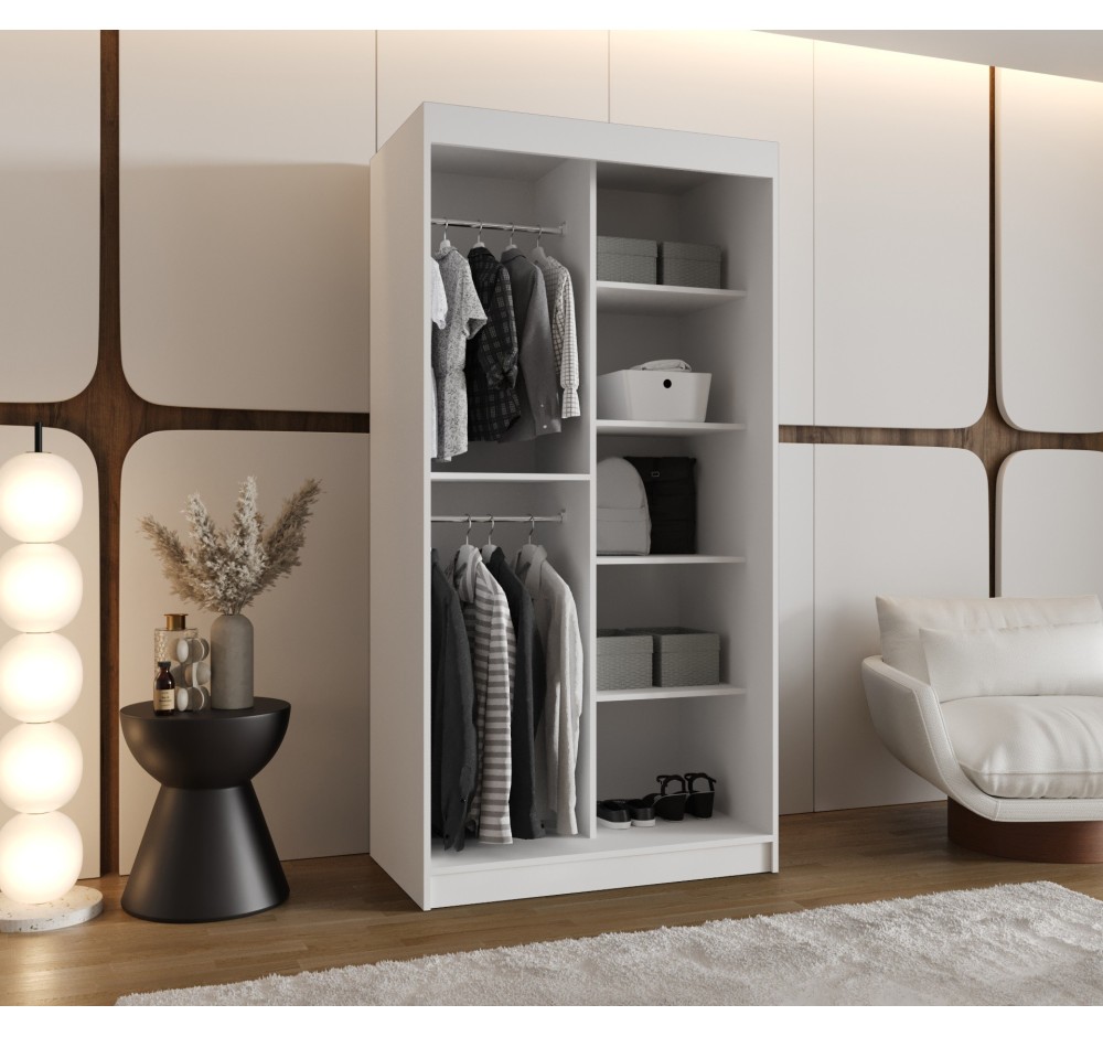 Haben Sie Probleme, Ihre Garderobe platzsparend unterzubringen? Wir haben die Lösung! Unser Schiebetürenschrank bietet maximalen Stauraum auf kompakter Fläche. Das moderne Design und die hochwertige Spiegeloptik machen ihn zur idealen Wahl für jedes Schlafzimmer oder Flur – unabhängig von der Raumgröße